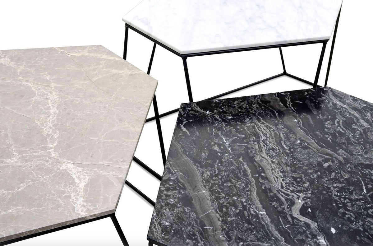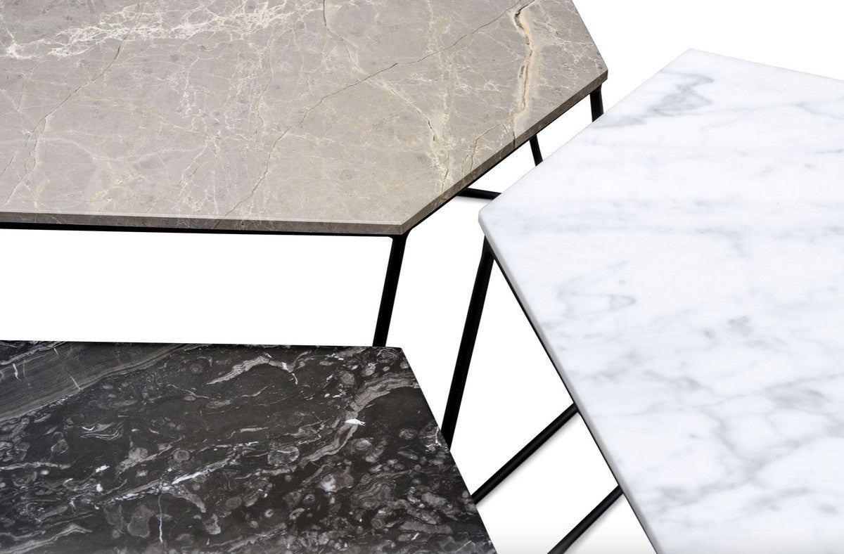 Da die Tischplatten aus Naturstein (Marmor) bestehen, können sie in Farbe und Struktur variieren.