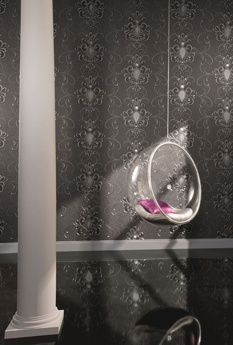 Harald Glööckler Designer Barock Vliestapete 58560 - Ornamente mit Strasssteinen - Grau / Anthrazit