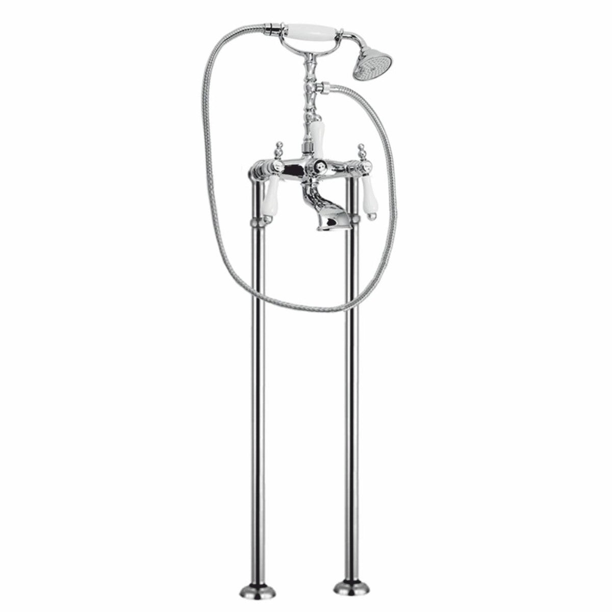 Gefertigt aus hochwertigem, verchromtem Messing und mit eleganten Keramikgriffen versehen, überzeugt diese freistehende Armatur durch ihre außergewöhnliche Materialqualität und langlebige Verarbeitung. Jedes Detail – von der präzisen Mechanik bis zur stilvoll geschwungenen Formgebung – zeugt von traditioneller Handwerkskunst und einem hohen Anspruch an Design und Funktion.
