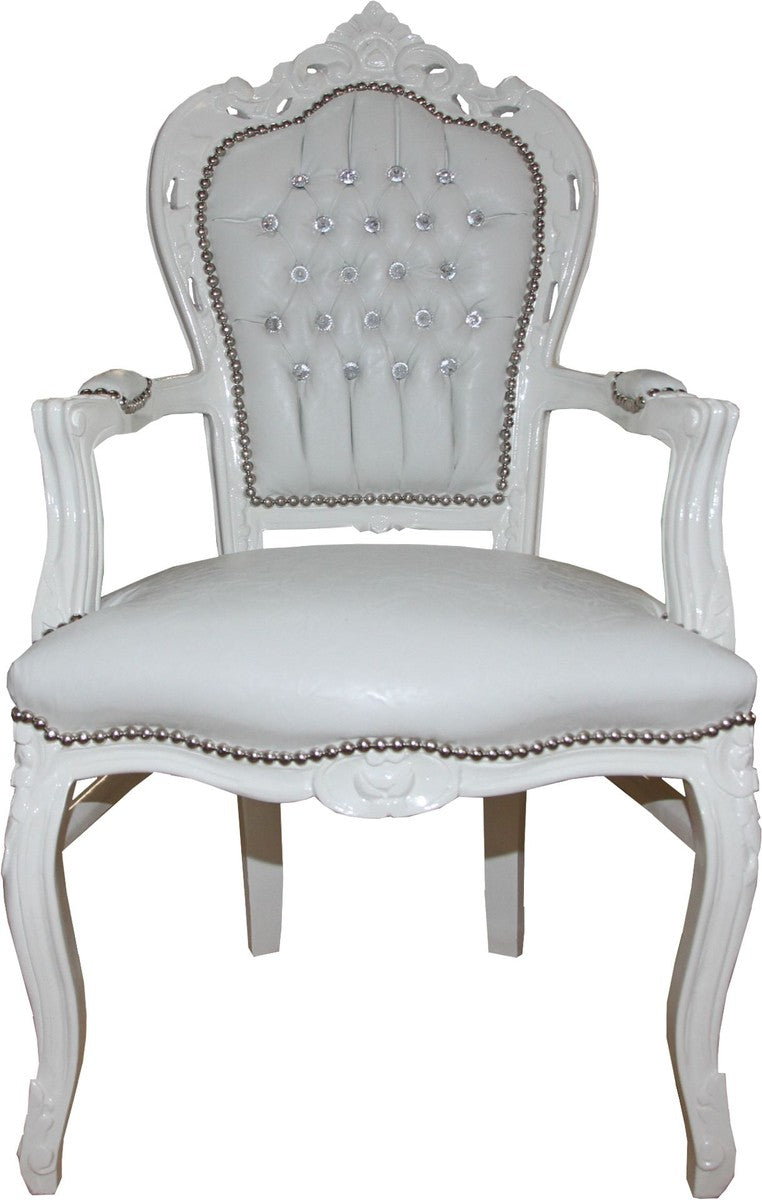 Barock Esszimmer Stuhl mit Armlehnen weiß / weiß Croco Lederoptik mit Bling Bling Glitzersteinen