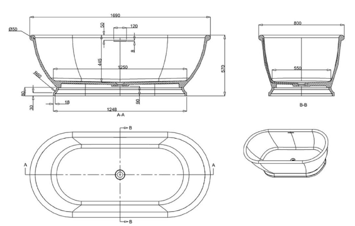 Freistehende Luxus Jugendstil Badewanne Weiß 169 x 80 x H. 57 cm - Luxus Qualität