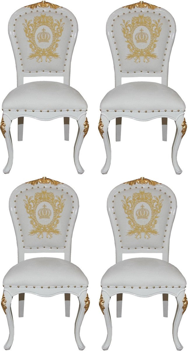 Pompöös by Luxus Barock Esszimmerstühle mit Krone Weiß / Gold - Pompööse Barock Stühle designed by Harald Glööckler - 4 Esszimmerstühle - Barock Esszimmermöbel
