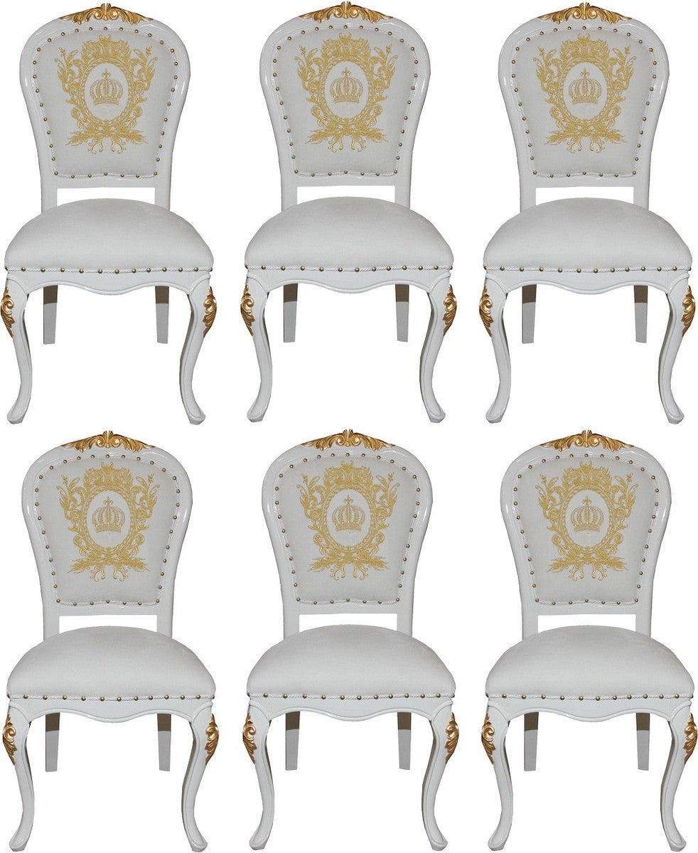 Pompöös by Luxus Barock Esszimmerstühle mit Krone Weiß / Gold - Pompööse Barock Stühle designed by Harald Glööckler - 6 Esszimmerstühle - Barock Esszimmermöbel