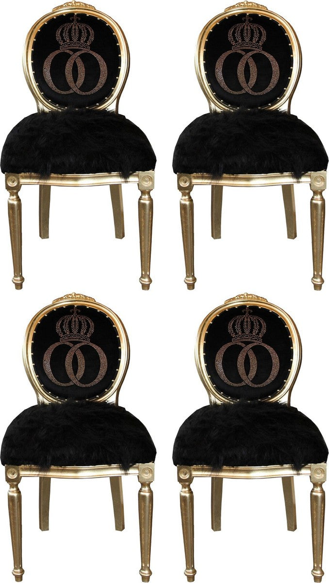 Pompöös by Luxus Barock Esszimmerstühle Kunstfell Schwarz / Gold Krone mit Glitzersteinen 50 x 60 x H. 104 cm - Pompööse Barock Stühle designed by Harald Glööckler - 4 Esszimmerstühle
