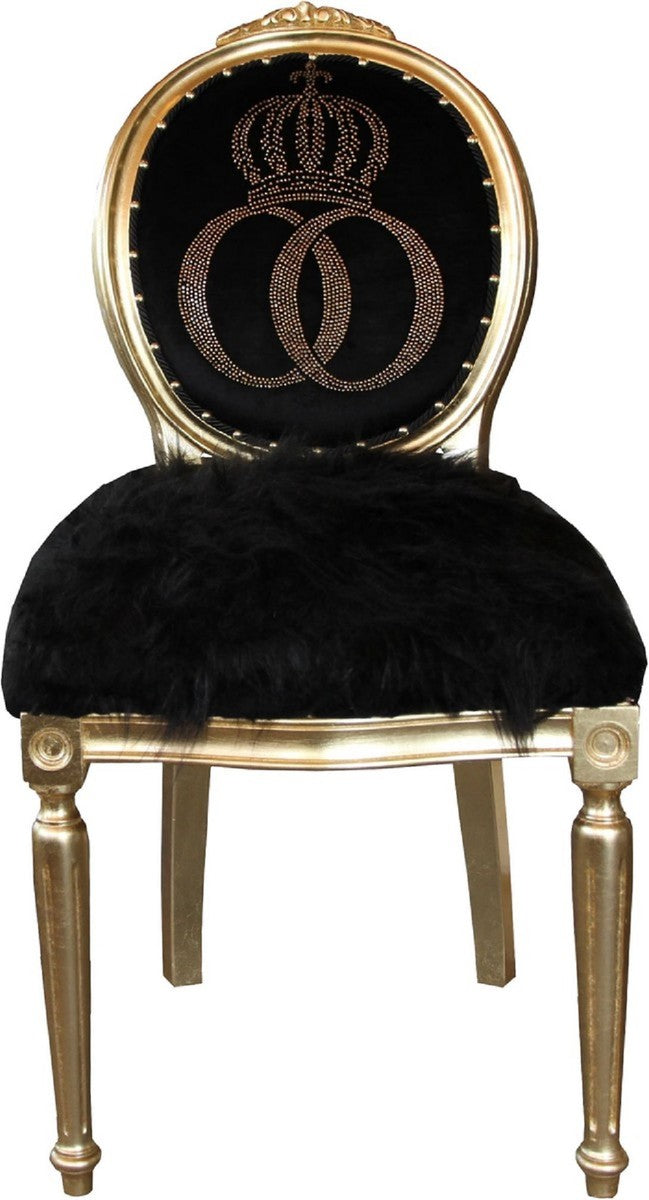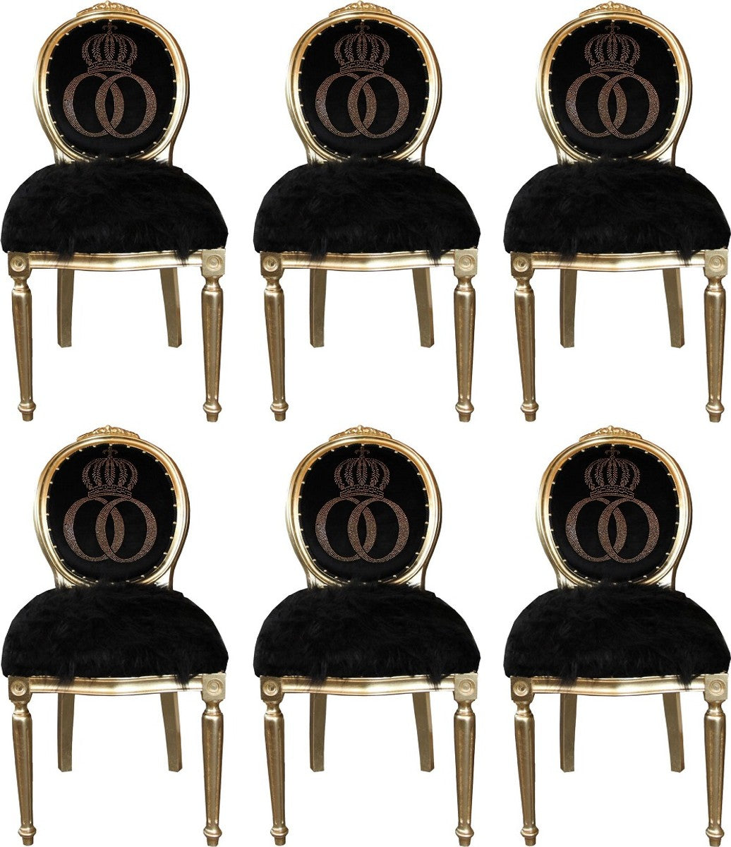 Pompöös by Luxus Barock Esszimmerstühle Kunstfell Schwarz / Gold Krone mit Glitzersteinen 50 x 60 x H. 104 cm - Pompööse Barock Stühle designed by Harald Glööckler - 6 Esszimmerstühle