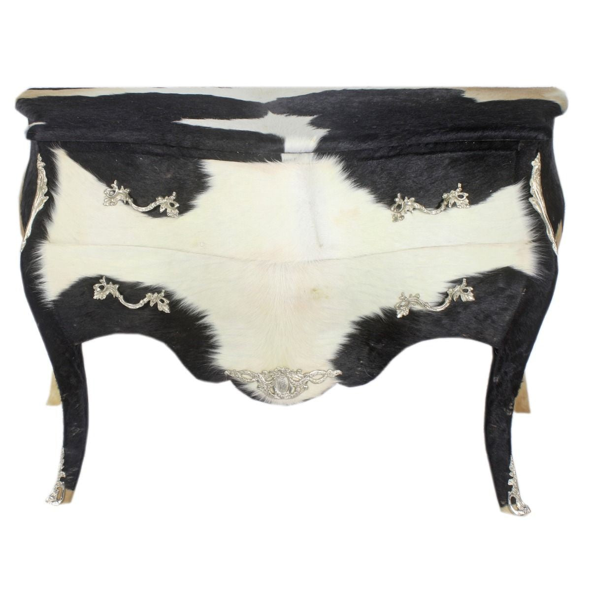 Barock Kuhfell Kommode Schwarz / Weiß mit silbernen Metallapplikationen 120 cm - Antik Stil Möbel