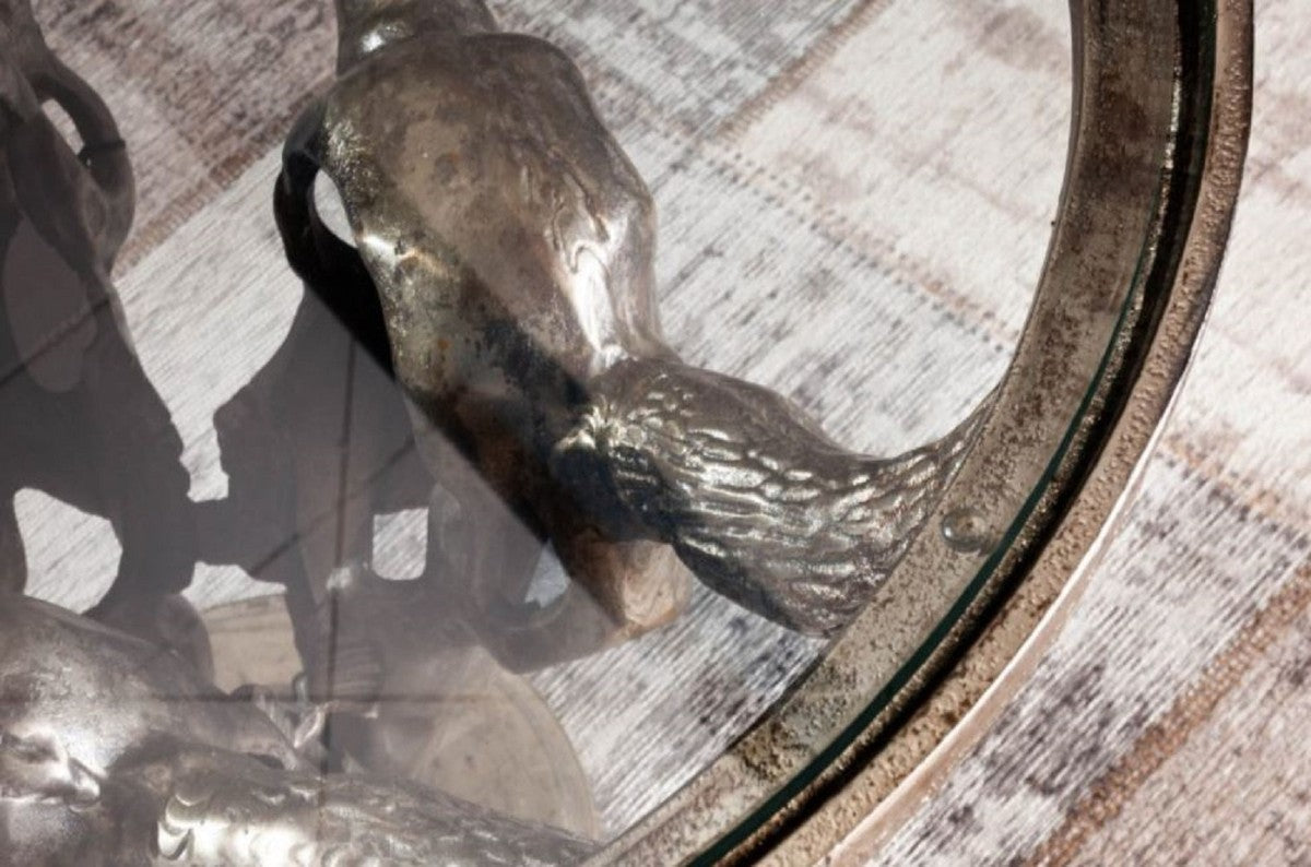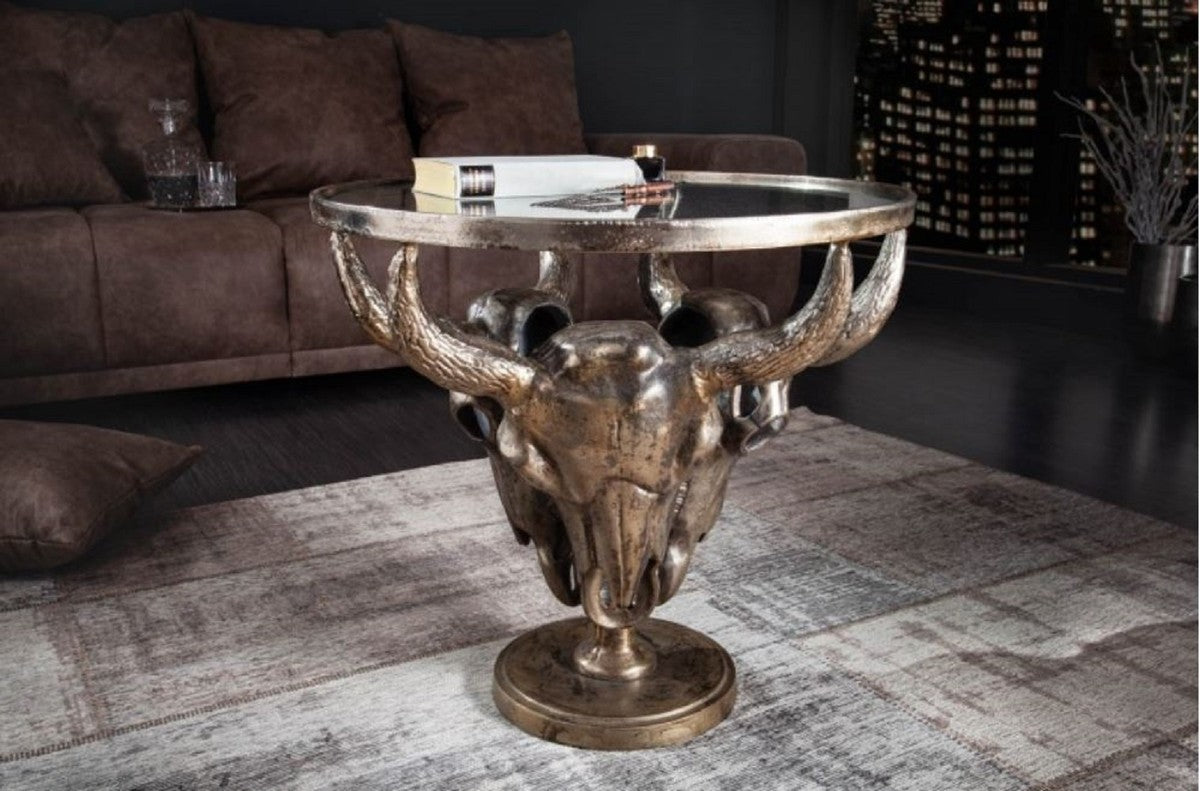 Designer Couchtisch Antik Bronze Ø 56 x H. 53 cm - Runder Wohnzimmertisch mit 3 dekorativen Stierköpfen und Glasplatte - Wohnzimmer Möbel