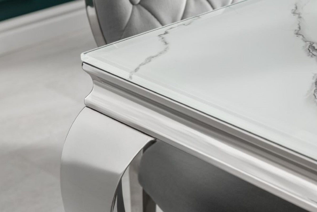 Designer Esstisch Weiß / Grau / Silber 200 x 105 x H. 75 cm - Rechteckiger Edelstahl Küchentisch mit digitalbedrucktem Sicherheitsglas in Marmoroptik - Moderne Barock Möbel