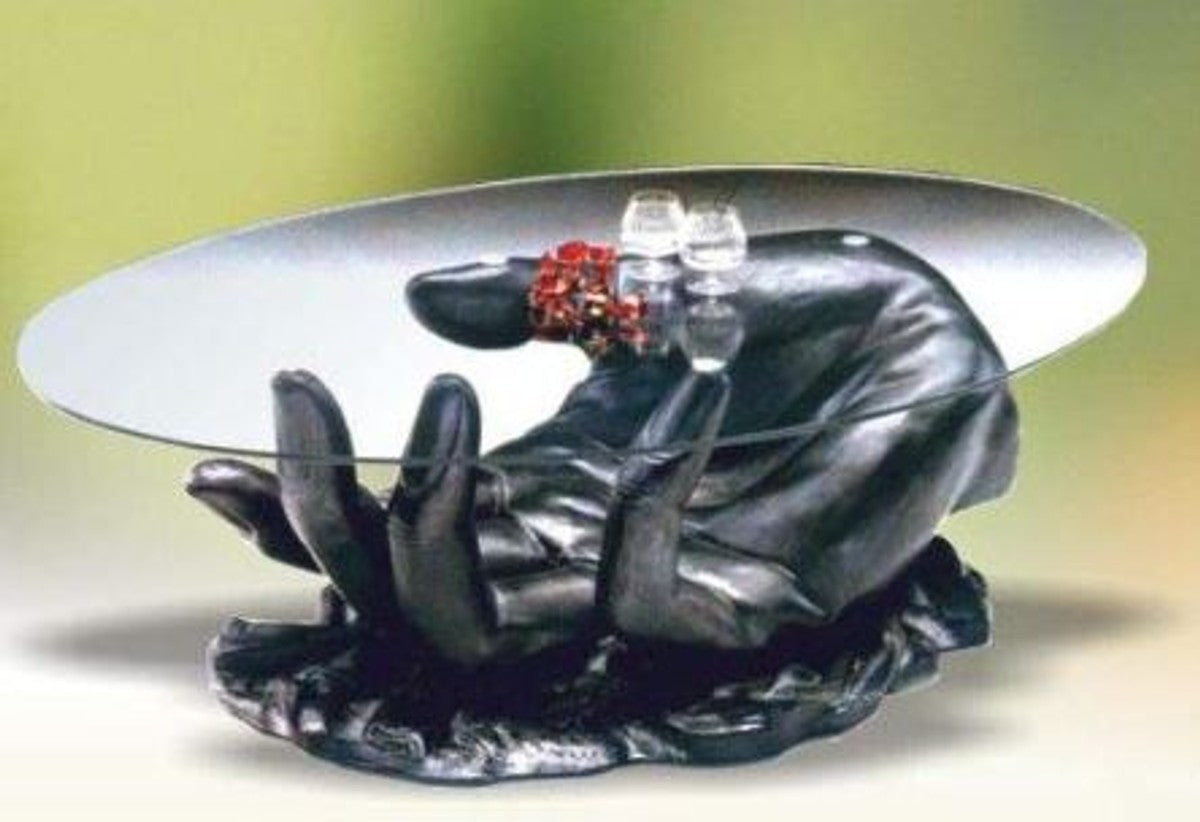Designer Couchtisch Hand Schwarz 89 x 60 x H. 43,5 cm - Wohnzimmertisch mit ovaler Glasplatte - Designer Wohnzimmer Möbel