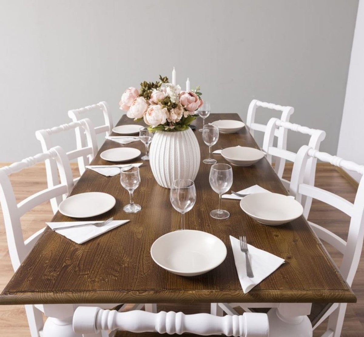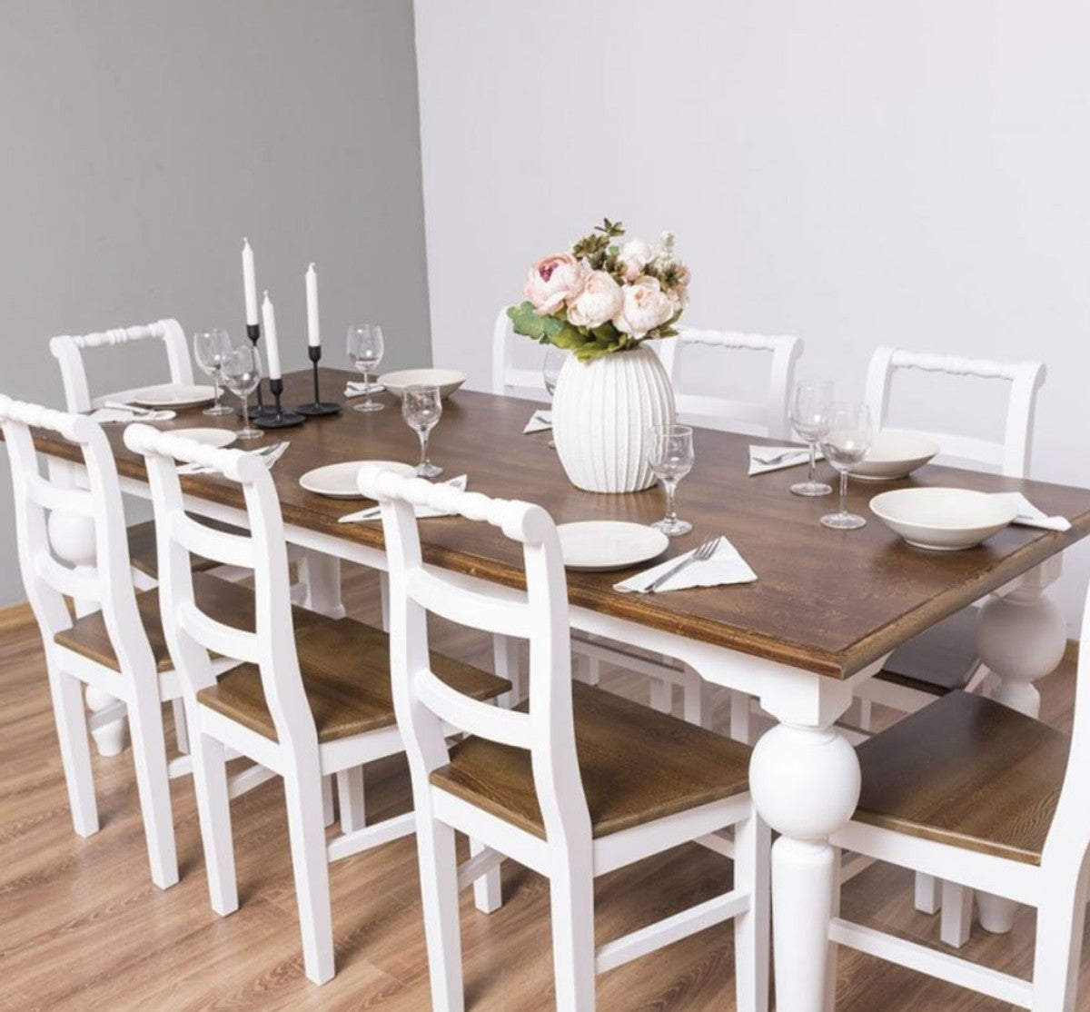 Landhausstil Esszimmer Möbel Set Braun / Weiß - 1 Esstisch & 8 Esszimmerstühle - Massivholz Esszimmer Möbel - Landhausstil Möbel