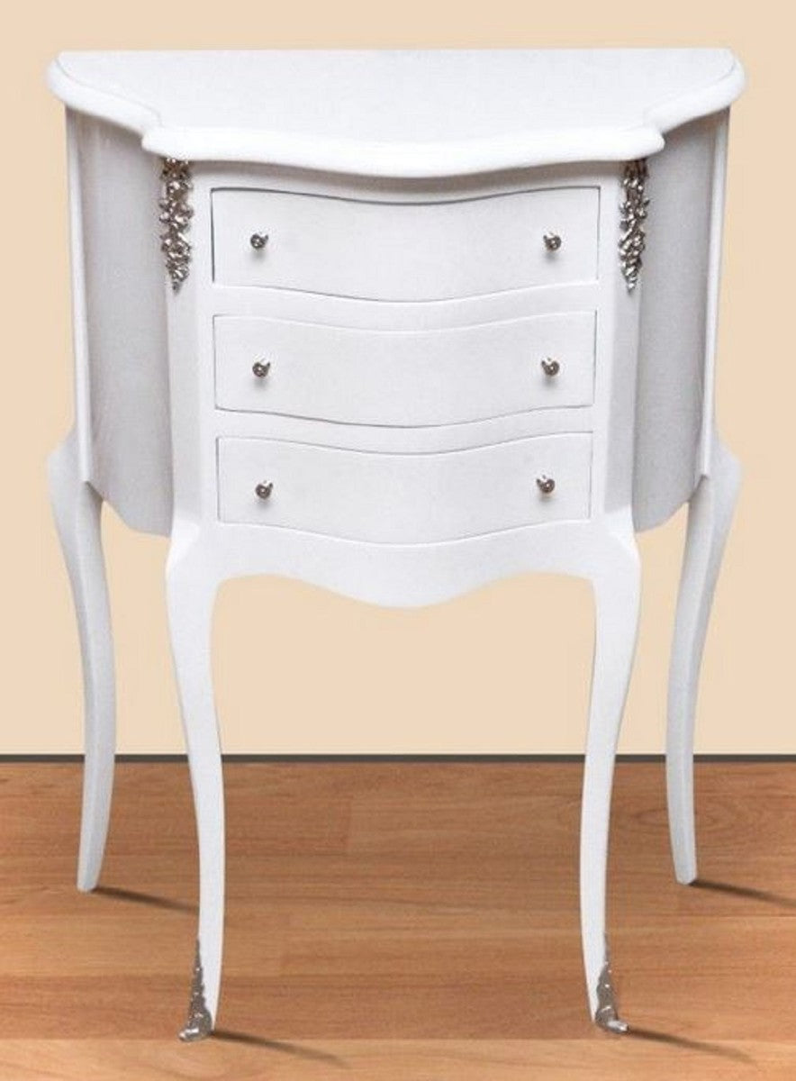 Barock Nachtkommode Weiß / Silber - Massivholz Nachttisch - Beistelltisch mit 3 Schubladen - Handgefertigte Barock Möbel