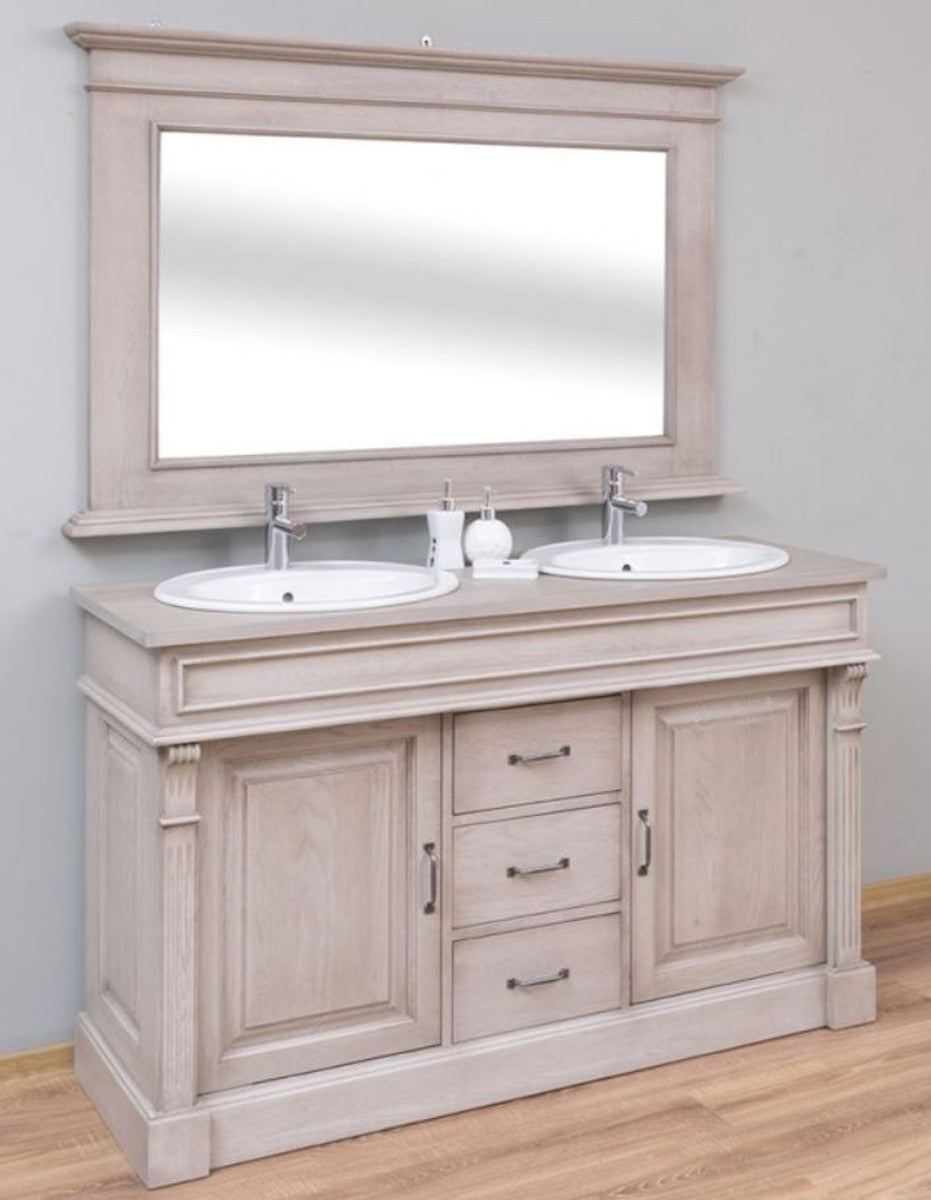 Landhausstil Badezimmer Set Grau - 1 Doppelwaschtisch & 2 Waschbecken & 2 Wasserhähne & 1 Wandspiegel - Massivholz Badezimmermöbel im Landhausstil