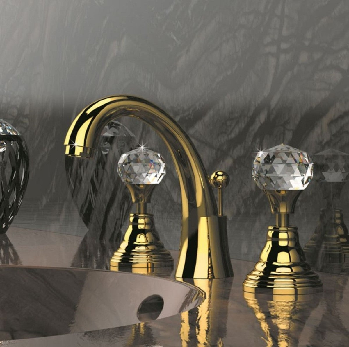Luxus Waschtisch Armatur mit Swarovski Kristallglas Gold H. 15 cm - Dreilochbatterie mit Ablaufgarnitur - Luxus Bad Zubehör - Made in Italy