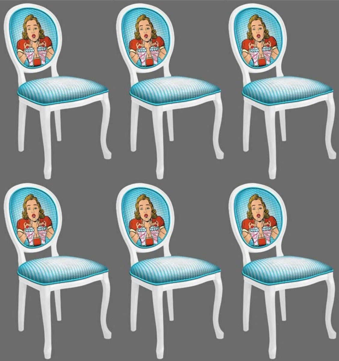 Barock Esszimmerstuhl Set Blau / Mehrfarbig / Weiß - 6 Handgefertigte Küchen Stühle im Barockstil - Barock Esszimmer Möbel