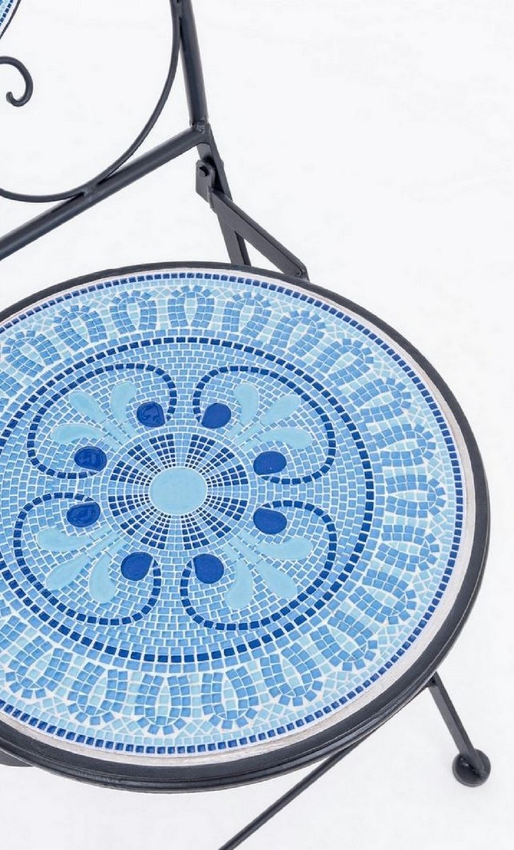 Jugendstil Gartenstuhl 6er Set Schwarz / Blau / Weiß 39 x 47 x H. 92 cm - Klappbare Stühle mit Keramik Platten - Nostalgische Garten & Gastronomie Möbel