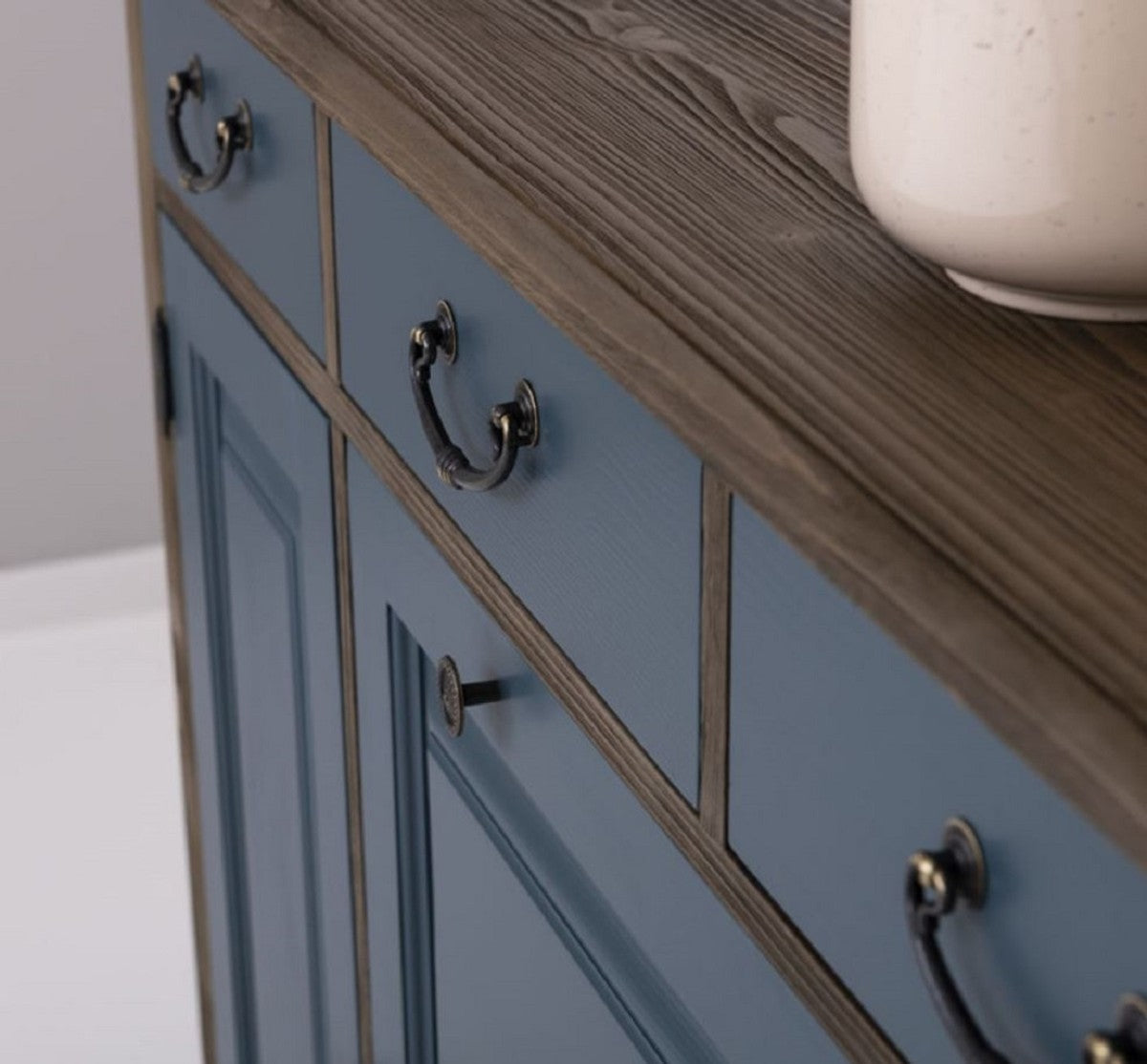 Landhausstil Kommode Blau / Schwarz 176 x 35 x H. 105 cm - Massivholz Schrank mit 6 Schubladen und 2 Türen - Landhausstil Möbel - Möbel im Landhausstil - Landhausstil Einrichtung