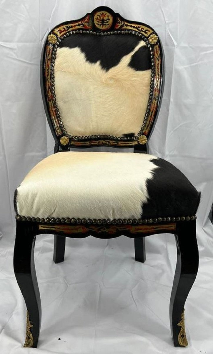 Barock Boulle Esszimmer Stuhl Weiß / Schwarz / Rot / Gold - Prunkvoller Stuhl mit edlem Fell - Esszimmer Möbel im Barockstil - Barock Interior - Barock Boulle Möbel