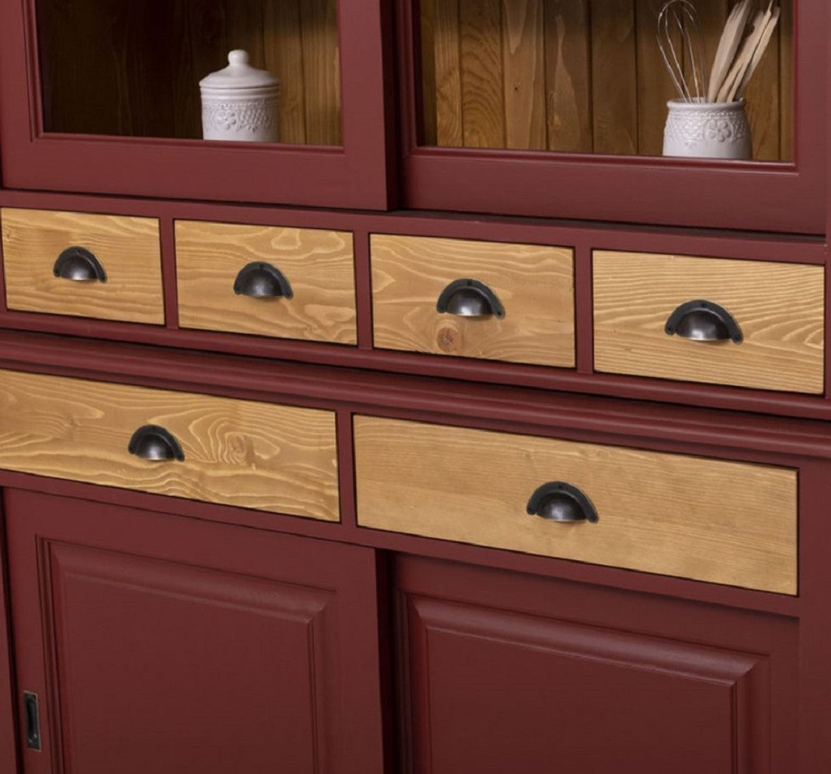 Landhausstil Esszimmerschrank Bordeauxrot / Naturfarben 142 x 48 x H. 225 cm - Massivholz Küchenschrank - Landhausstil Esszimmer Möbel