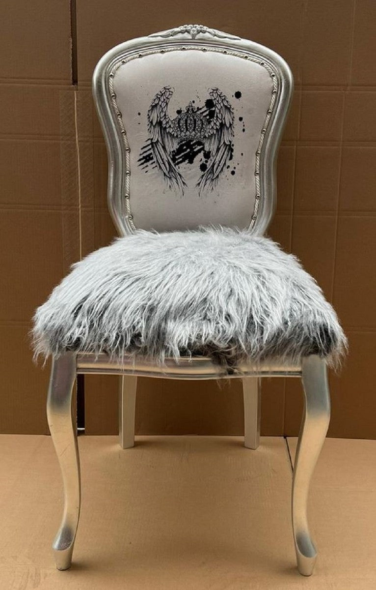 Pompöös by Luxus Barock Esszimmer Stuhl Krone mit Kunstfell und Glitzersteinen Grau / Weiß / Silber - Pompööser Barock Stuhl designed by Harald Glööckler