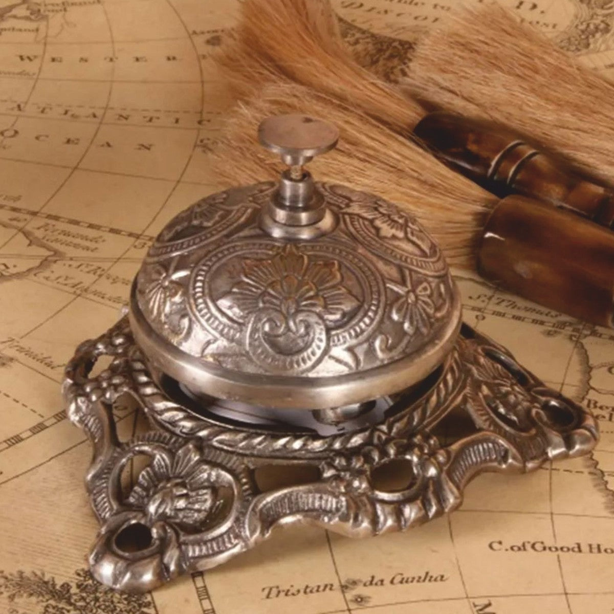 Die fein gearbeiteten Verzierungen im klassischen Barockstil verleihen der Tischglocke eine außergewöhnliche Detailtiefe und unterstreichen ihren repräsentativen Charakter. Die Oberfläche des Messings reflektiert das Licht auf dezente Weise und bringt zeitlose Eleganz in jeden Raum.