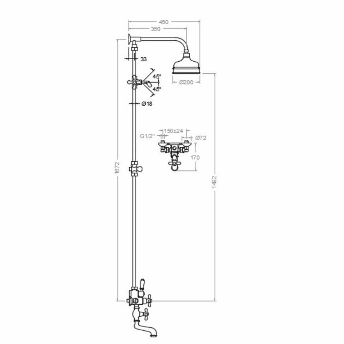 Jugendstil Badewannenarmatur mit Überkopfbrause und Handbrause H. 167,2 cm