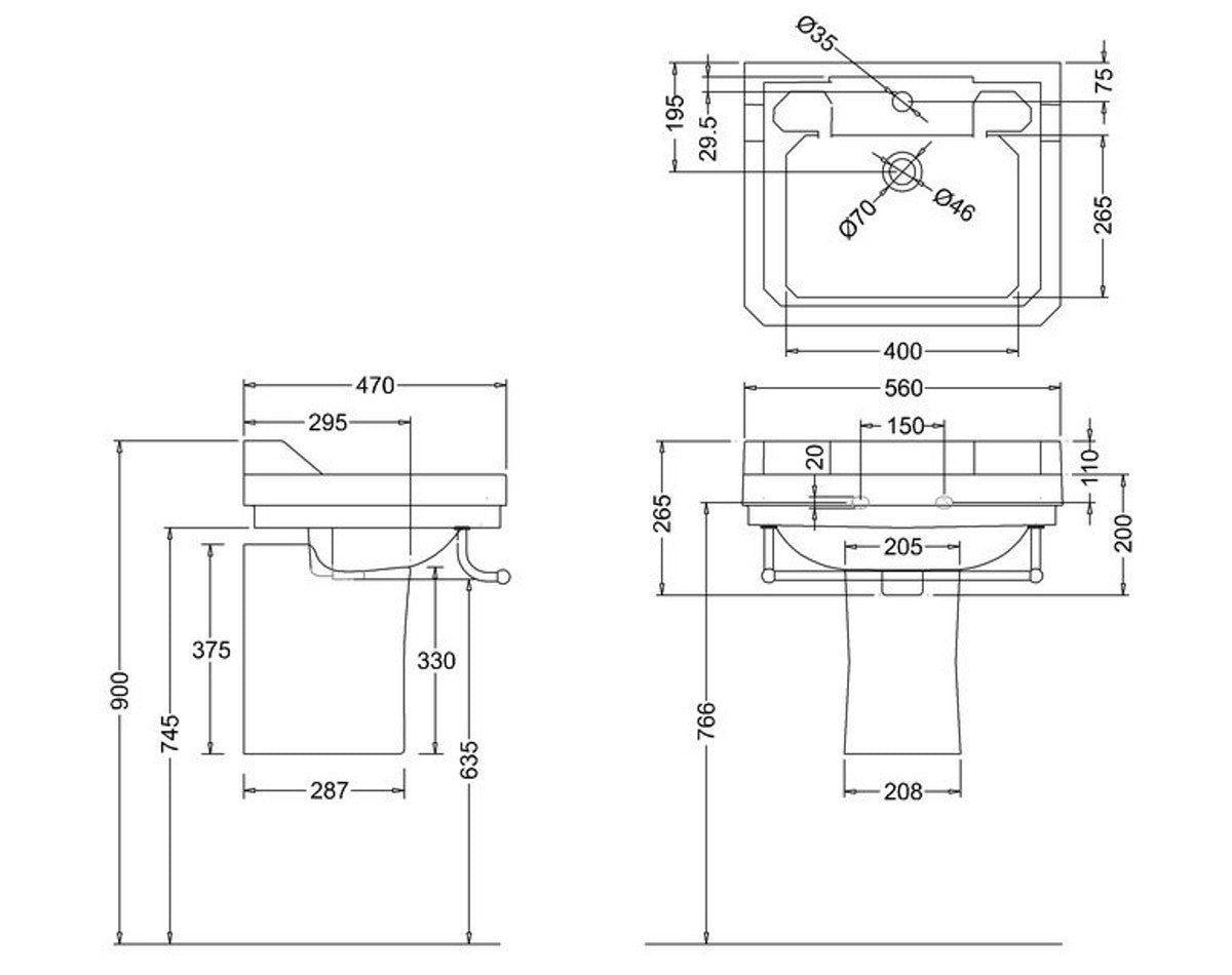 Porzellan Waschbecken mit halben Sockel 56 x 47 x H. 56 cm
